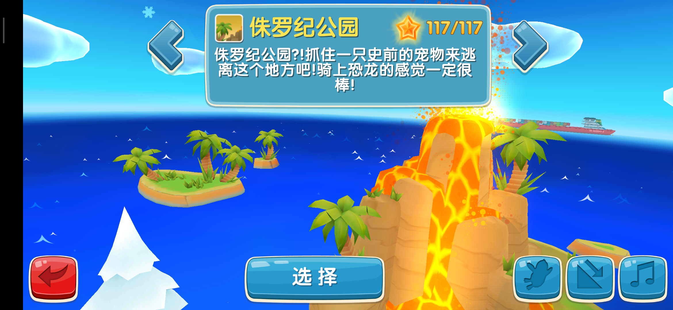 那滑雪大冒险2做出了哪些新东西呢?首先还是地图,除了企鹅峰滑雪大冒险2并没有将滑雪大冒险中其他的地图搬进来,不过有两个类似的地图——鬼怪老山、北极。还有其他三个地图是侏罗纪公园、西部峡谷、神秘月球。无论是类似的还是全新的,每一个地图都对应的新的场景,新的动物,新的彩蛋。比如侏罗纪公园里面雪崩改成了岩浆,西部峡谷中则换成飓风,左上角的警告也变成了岩浆或者龙卷风的标志。