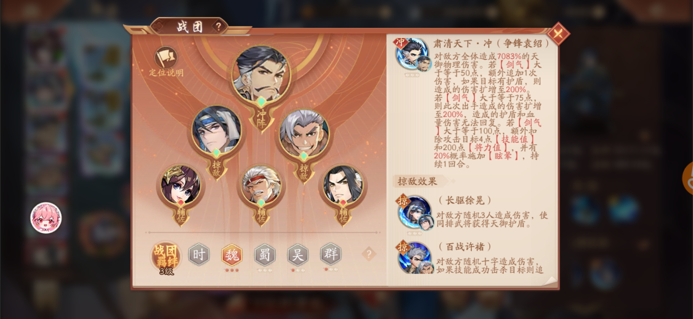 首先冲锋位置,也就是所说的战团的主力冲锋,拥有战团技冲锋技的效果以及动画,但是需要100点战团值才能触发,大家都知道看画面最上面的战团值数额来看武将触发战团技,一般一方释放战团技直到下回合对面才可以释放战团技,对面战团技也会显示灰色的,但是我在实战发现个bug(也不知道算不算bug,是由天金2神兽羽毛复活带来的)释放完战团技阵亡的冲锋武将,在神兽复活下,能够再次释放一次战团技,而且0战团值释放,这让我觉得很奇怪,也不知道策划会不会去修复了。我还见过两方先后释放战团技,不得不说bug真多