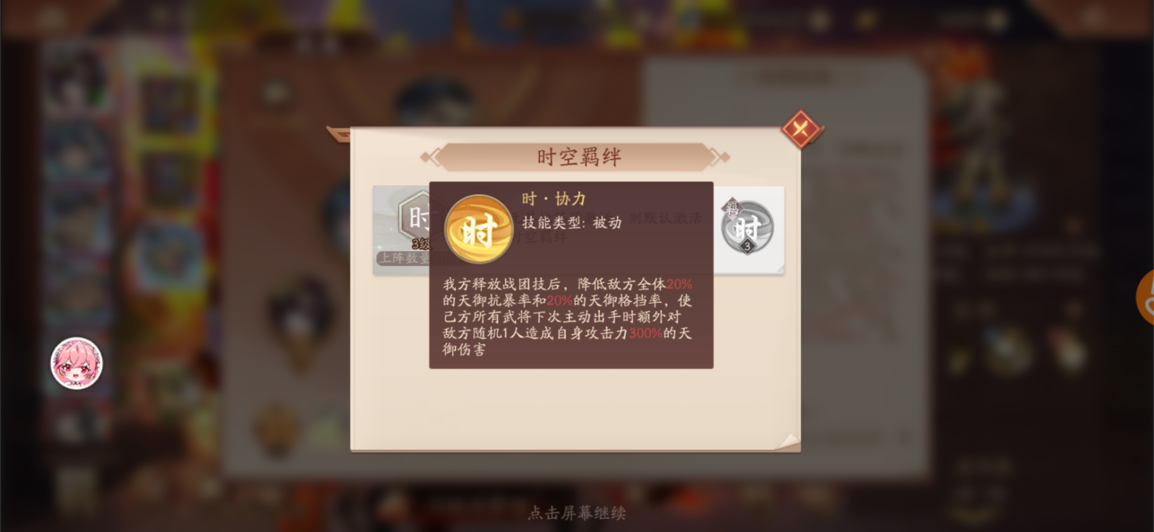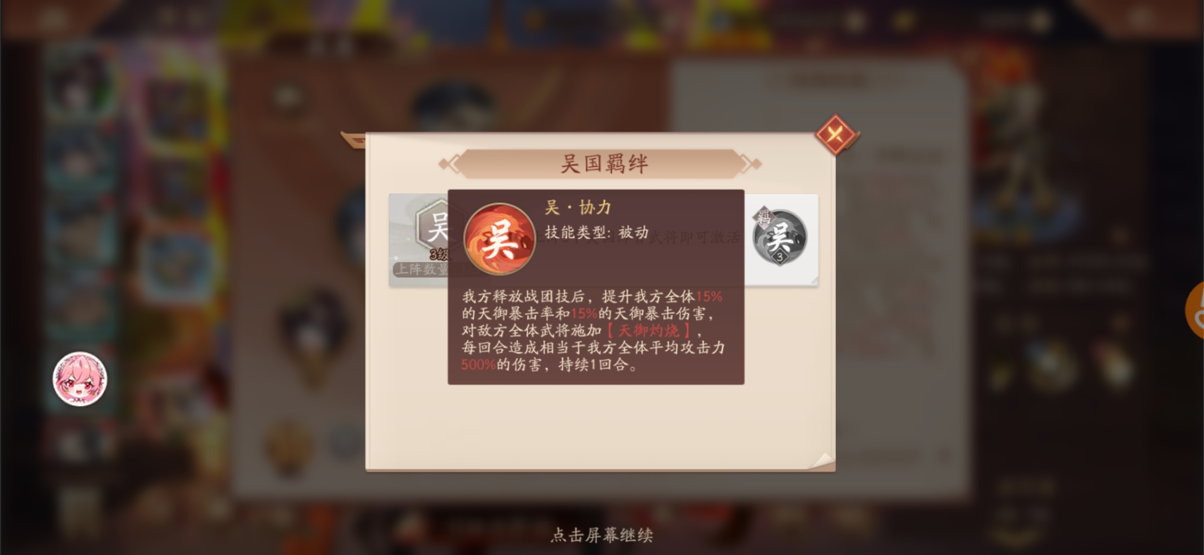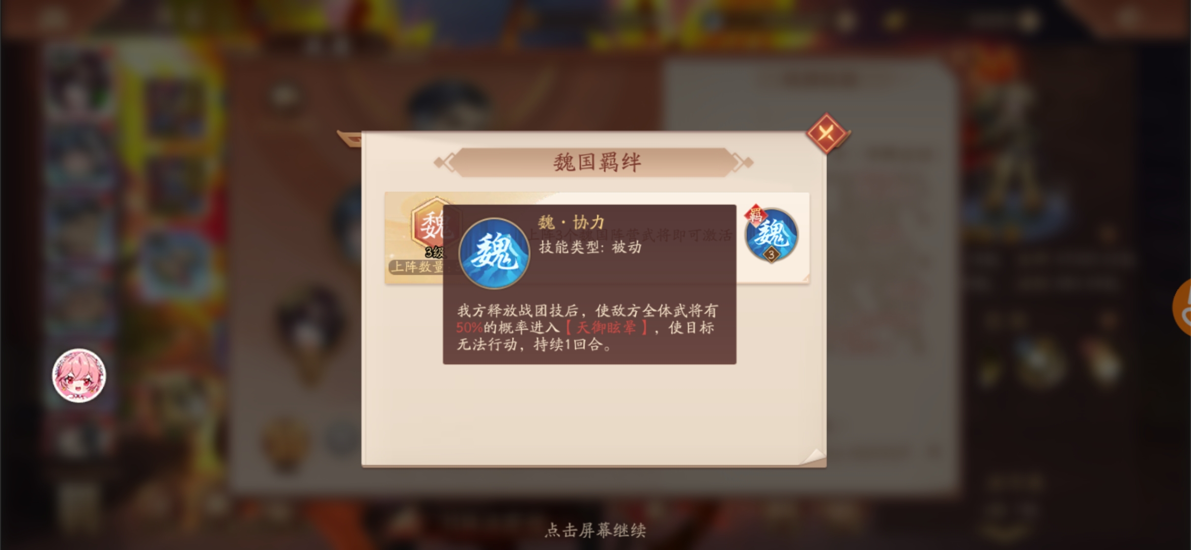 最后是战团羁绊,目前五个战团羁绊中最实用的是魏国(眩晕)吴国(加属性,灼烧),眩晕这个最实在,让对面少出手一次,灼烧也不错的,剩下三个战团羁绊都是属性类增益或者减益还有些其他效果,正常平民还是以战团羁绊为主,混国大佬肯定是时空羁绊