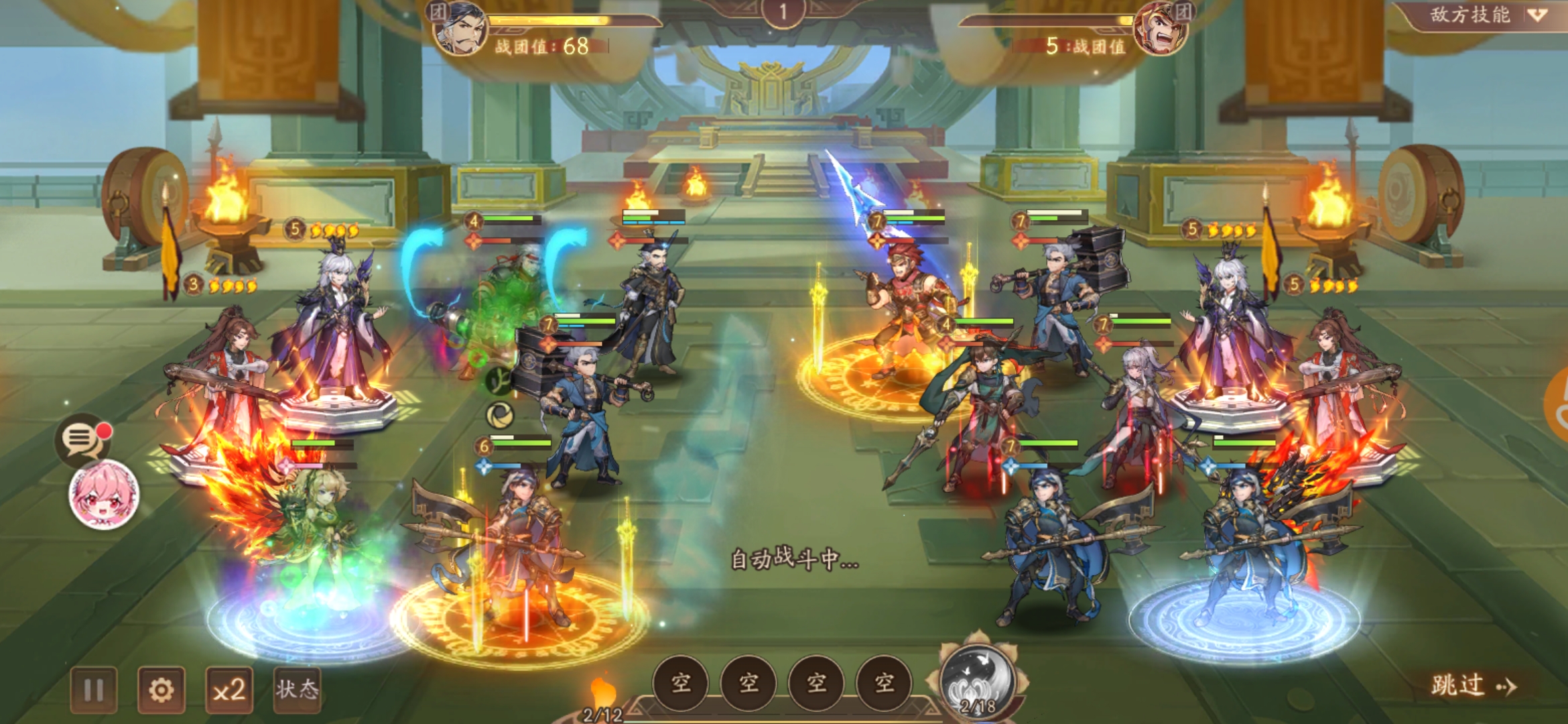 实战中,最上边是战团值;武将上面白色条是护盾值;绿色条是生命值;蓝色四格是技能值;武将下面红色条便是武将技。天金3武将触发技能和武将技的频率比前面武将高,所以无脑点技能和武将技星宫,取舍在战团技星宫和武将技星宫中选择![]()