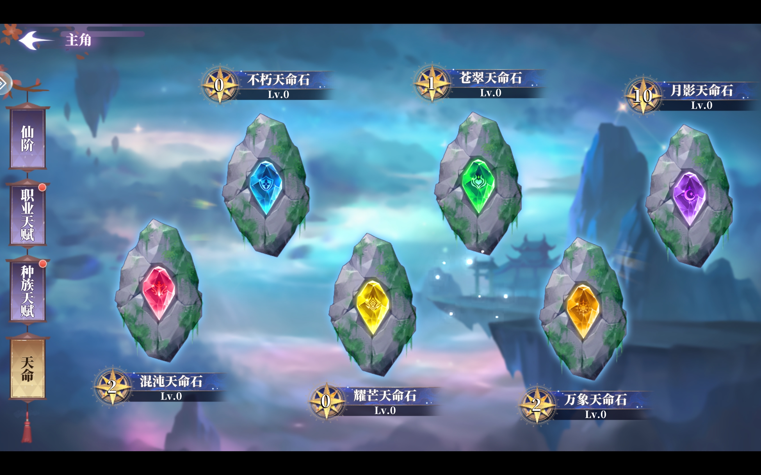 天命石系统可以简单的分为两个部分,镶嵌神话卡与升级天命石本体。在天命石系统中一共有六块天命石,分别为月影天命石,万象天命石,苍翠天命石,耀芒天命石,不朽天命石,混沌天命石,而不同天命石可镶嵌的神话卡也有本质上的不同,可镶嵌依次为全部紫色神话卡,通用金色神话卡,辅助类型神话卡,技巧类型神话卡,防御类型神话卡,攻击类型神话卡。神话卡星级越高,增加的战力就越多。初始神话卡卡槽一共有5个,利用天命石碎片可以升级天命石,每升10级开一个卡槽,最多五个。同品质不同类型神话卡所加战力大致相同,因此可以看出战力多少基本只与星级有关。