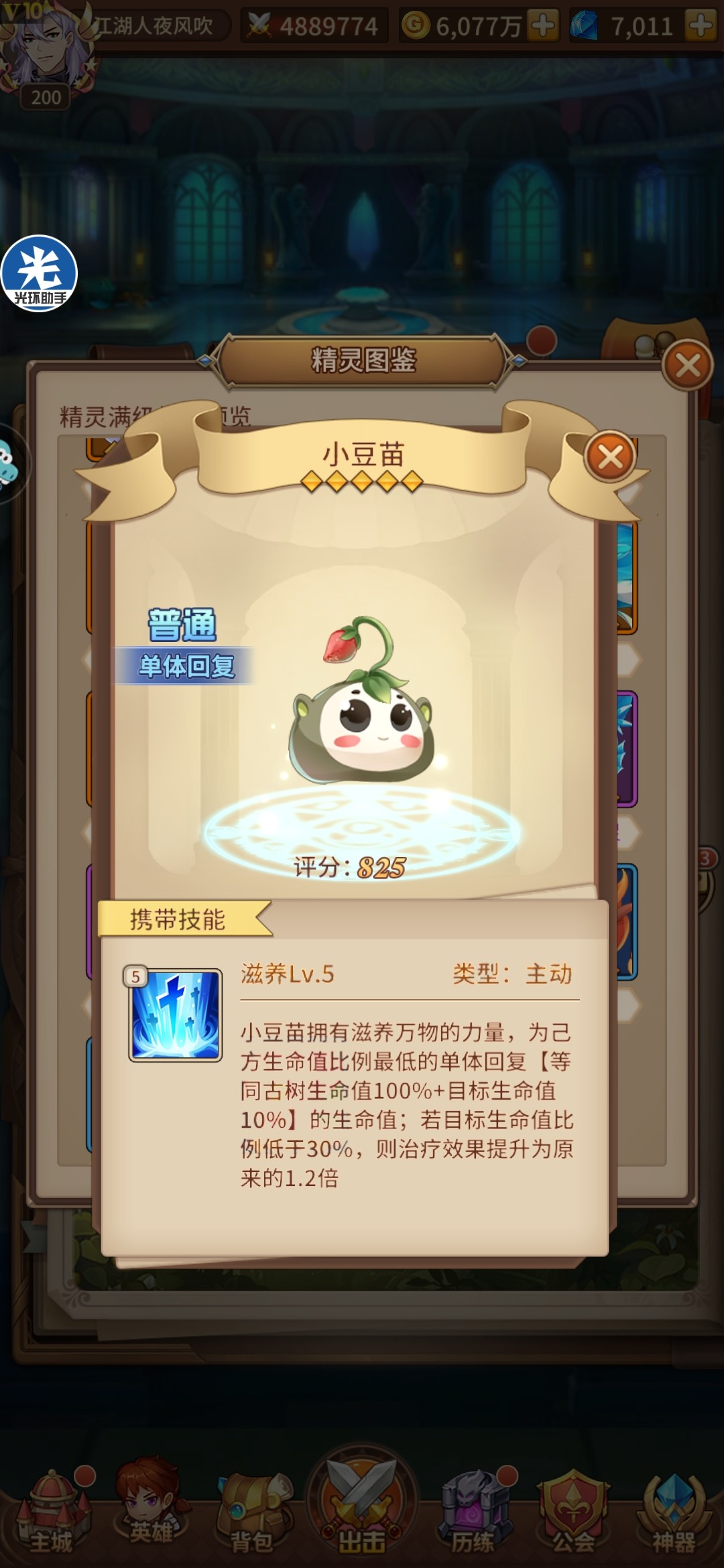 站位选择推荐三号位,四号位,其次二号位,这款精灵我曾看到五系阵容中四保一凤凰的极限凤凰流阵容使用过,加血效果很可观,尤其等古树等级达到200级,就是几百万回血的效果,如果你的阵容是以续航为主,那么可以去考虑小豆苗的,升星速度也是很快的,效果也是很不错的。