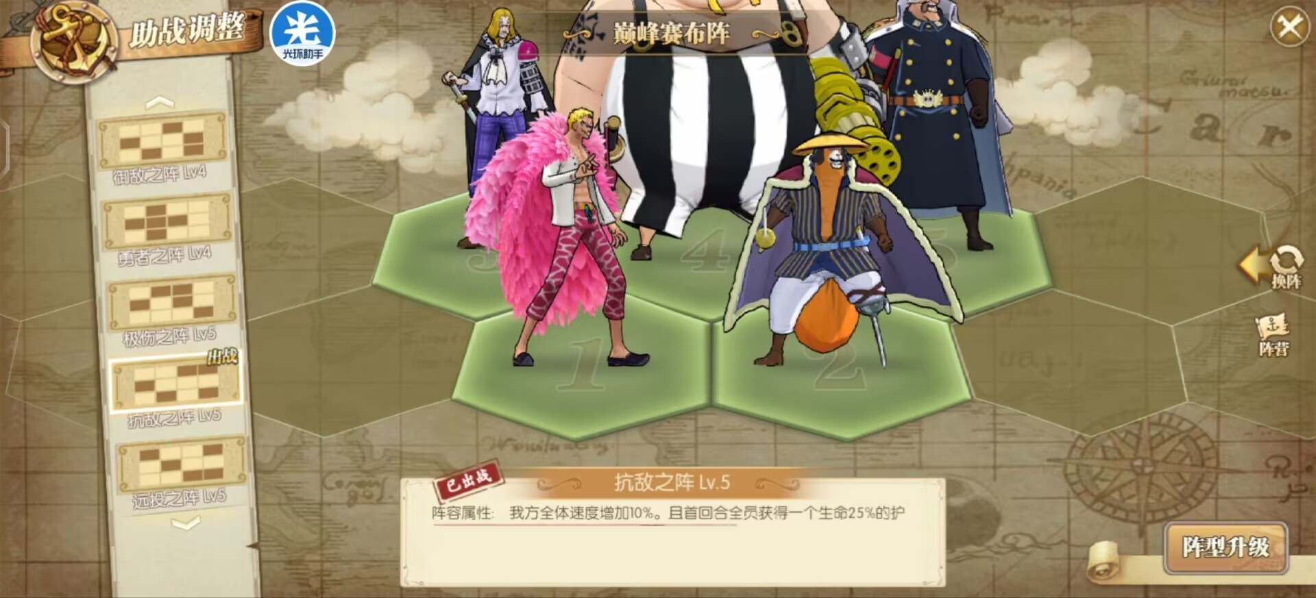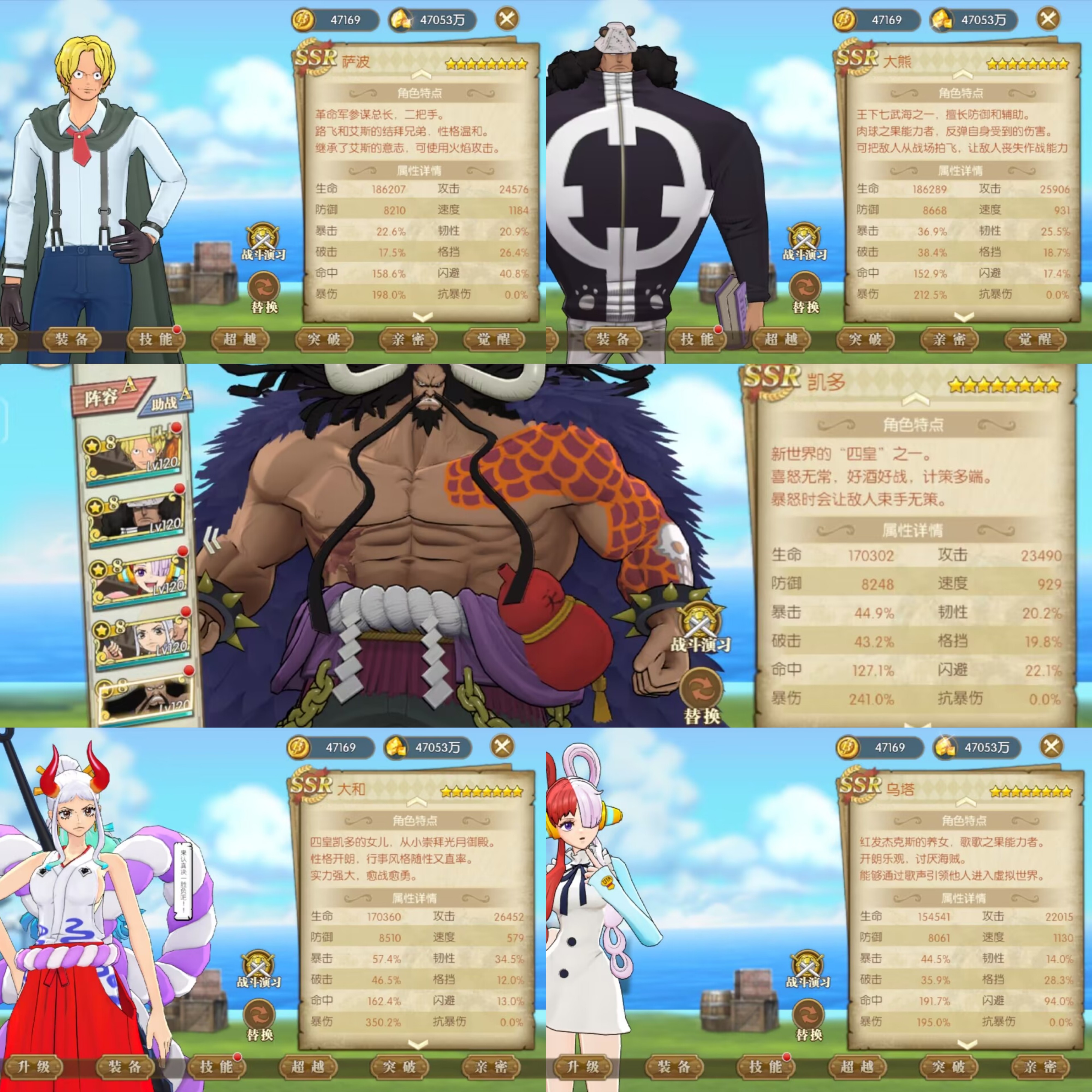 这是一套平民得不能再平民得面板,这里面得速度主要是凯多和大和,凯多穿的是散件让速度比大和快(因为大和开局有加成配合游侠套装高伤害有可能速度也很快,所以凯多没有高速就用散件堆上去,当然有领主啊氪金套估计会更好)其他的就是乌塔能快就快了。