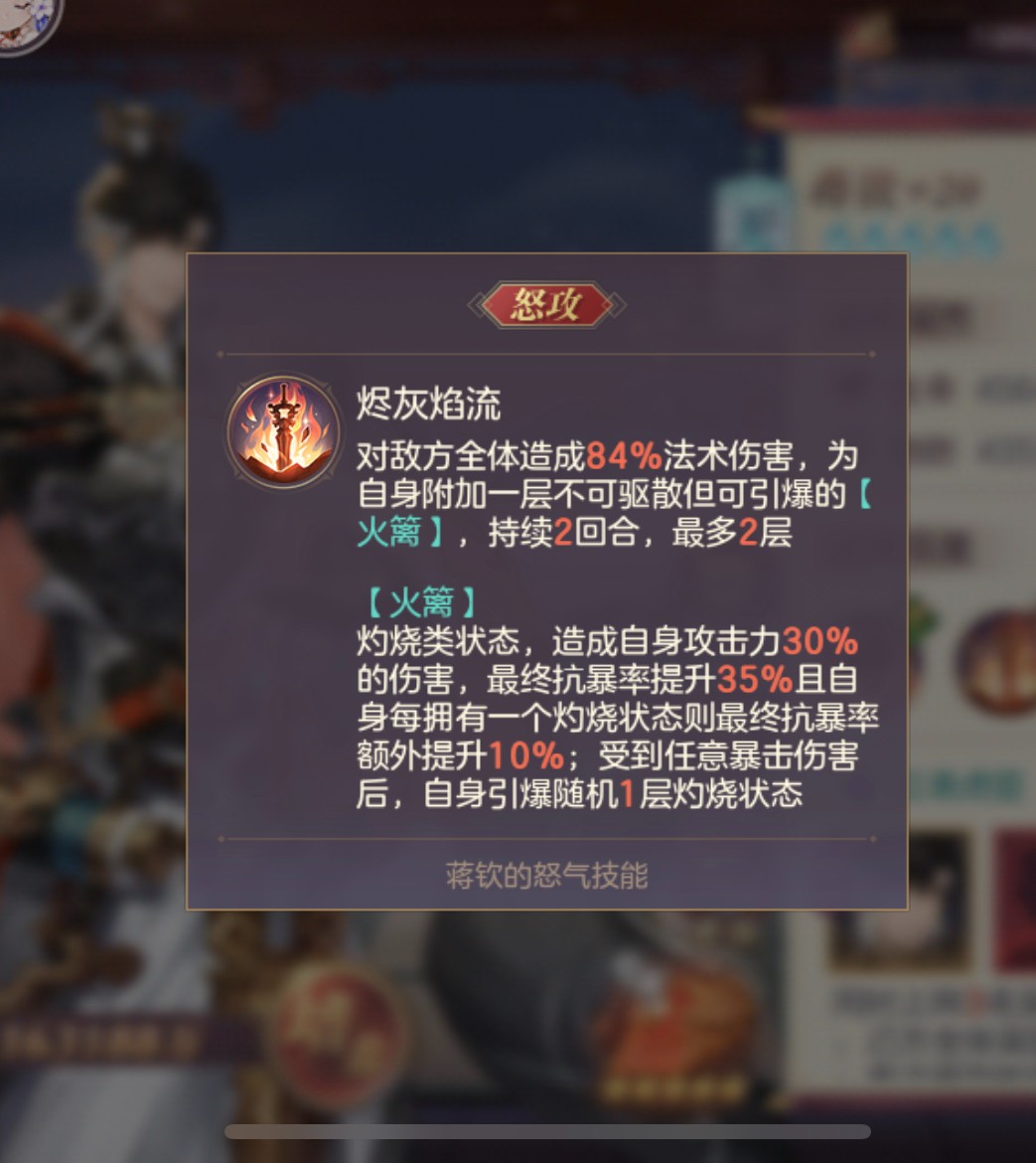 效果很容易理解,蒋钦有1层火篱,怒攻就能给对手挂1层火,蒋钦有2层火篱,怒攻就能给对手挂2层火。而细节部分在于,判定蒋钦有几层火篱的时间点,在蒋钦怒攻后,即蒋钦怒攻前没火篱的情况下,怒攻会给自己加1层,此时再计算层数,最后给对手挂1层灼烧。