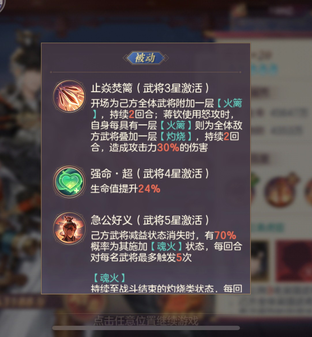 蒋钦怒攻,通过3星被动给对手挂火,可以触发徐盛疑城的判定(即可以获得疑城),注:弱点战魂的灼烧并不能触发疑城,即便是怒攻时触发的弱点挂火,也不能。