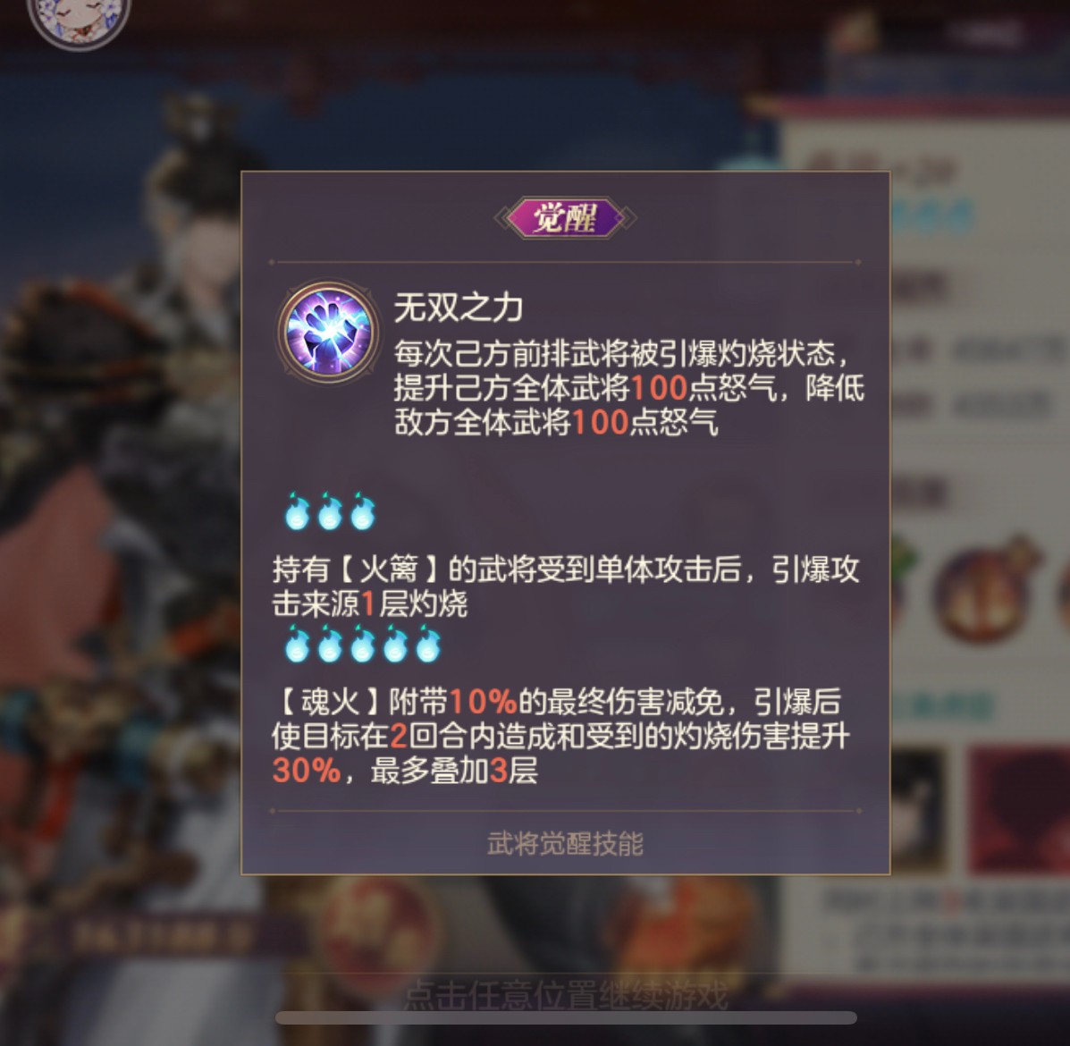再就是后半段的被引爆后,又加灼烧伤害,又加受到的灼烧伤害。实测发现,这2个效果都不会以buff形式显示在武将头顶,那么就可以默认为不可驱散了。