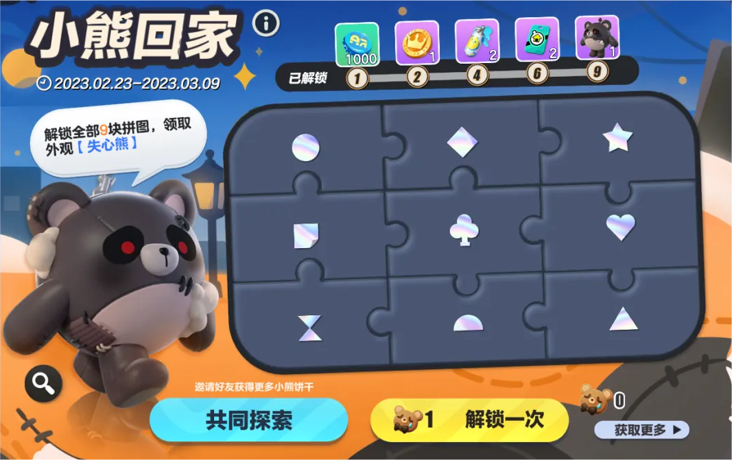 活动期间邀请好友助力、完成任务收集小熊饼干解锁拼图,即可将<失心熊>带回家!
