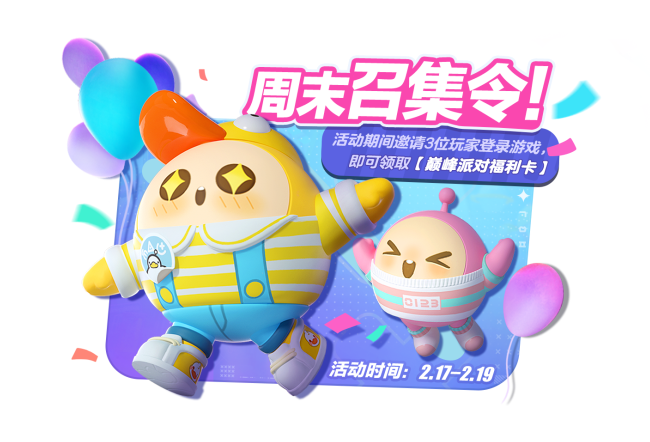 活动内容:邀请3位蛋仔登录游戏即可领取【巅峰派对福利卡】!快来蛋仔岛召唤你的蛋搭子一起参加周末派对吧!