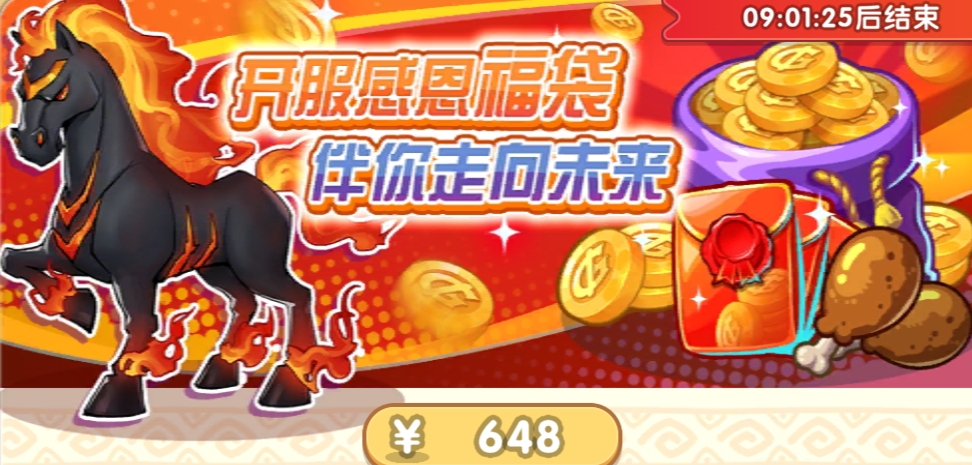 购买就送一匹传说宠物宝马,强大的战力推图pve,特定的挑战副本都非常好用,还送宠物经验和2000点红包。2000点红包可以换取2张传说卡,价值还是不错的,缺点是648元就送2000个金币,这点我很想吐槽。适合中氪玩家购买。