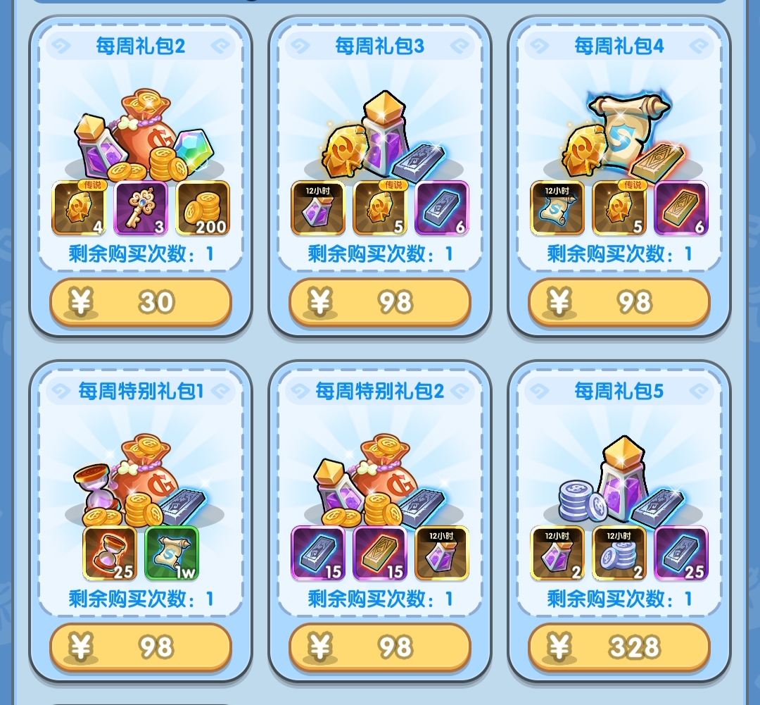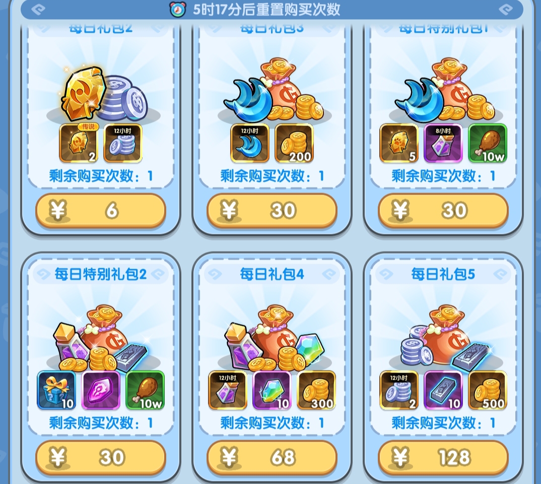 属于前期中期发育纯资源礼包,一共6个档位的礼包。其中128和68元档位的礼包性价比极低,只适合前期氪佬发育购买。