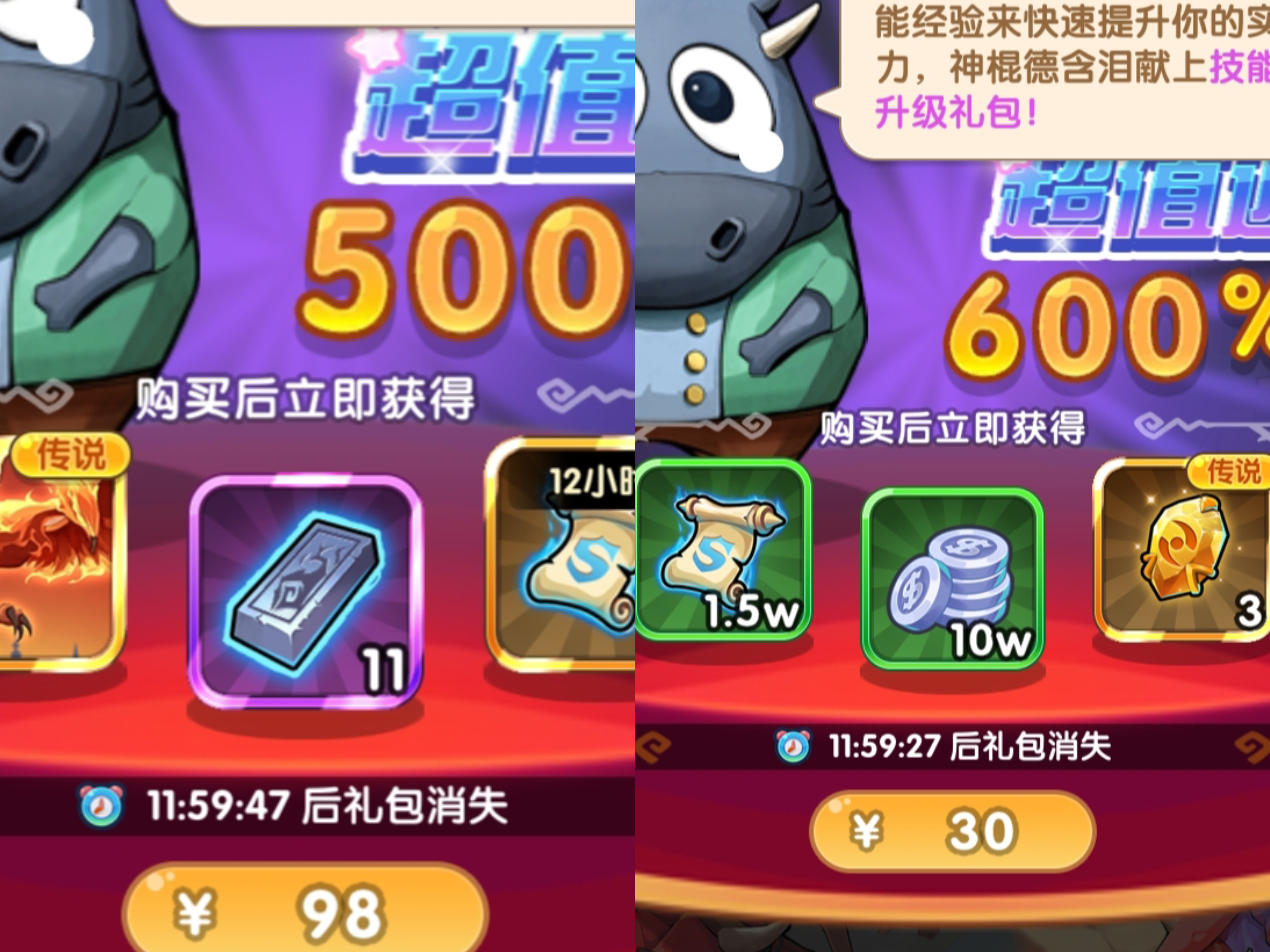 这些礼包到了固定等级或者是到了特定关卡开启的限时礼包,一般性价比总体来说比较高,但比较推荐氪传说卡和宠物向的礼包。毕竟放置游戏资源可以,存资源也是一种乐趣。