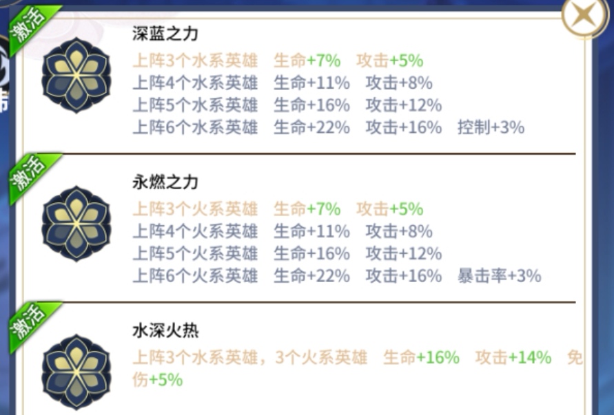 图中,为上阵三个水属性英雄与三个火属性英雄的属性加成。