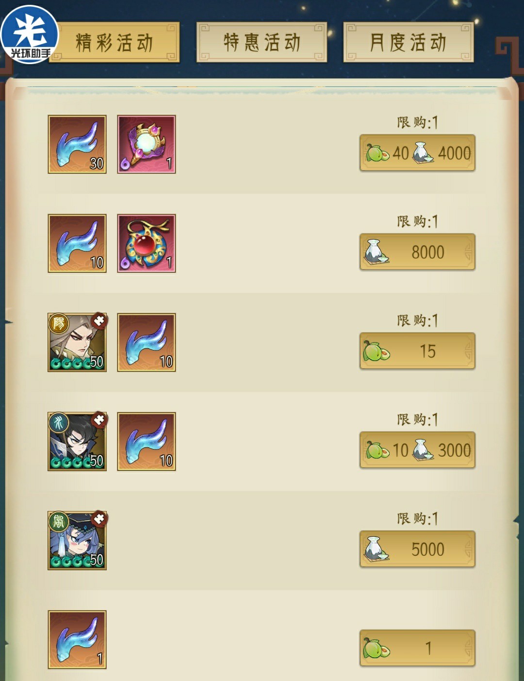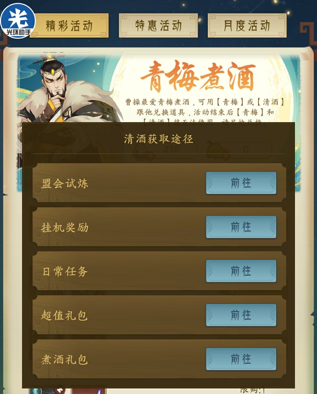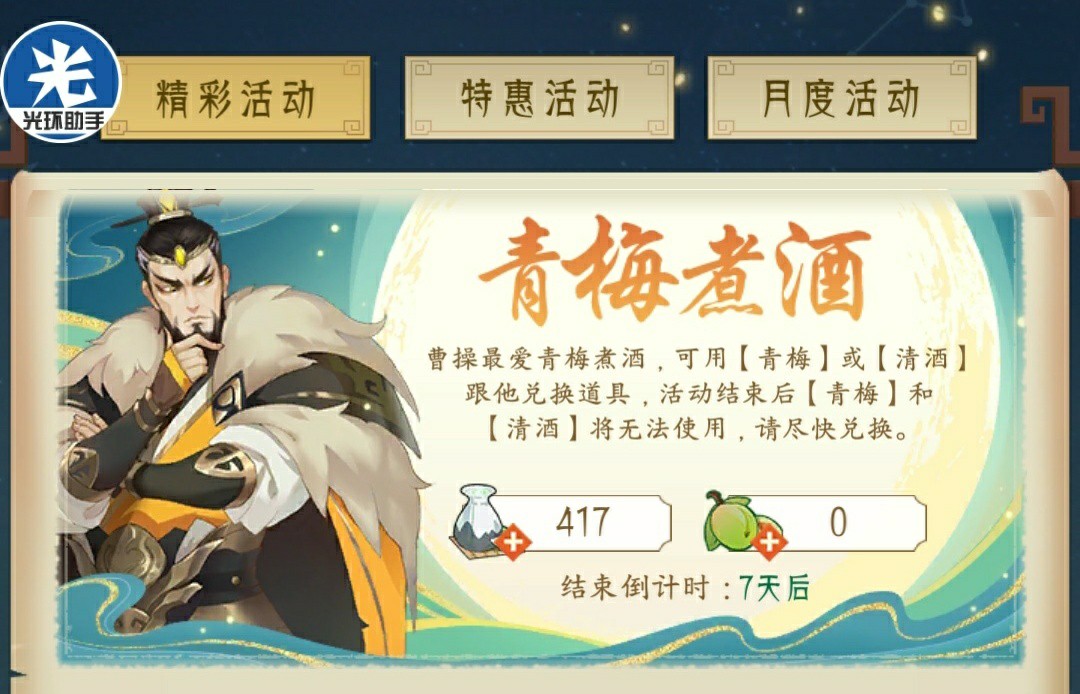这是获取信物清酒和青梅的的途径,活动数量随机,而且是非常容易达成的条件,不过青梅就需要氪金才能获得了~毕竟青梅能换取的奖励还是很可观的~