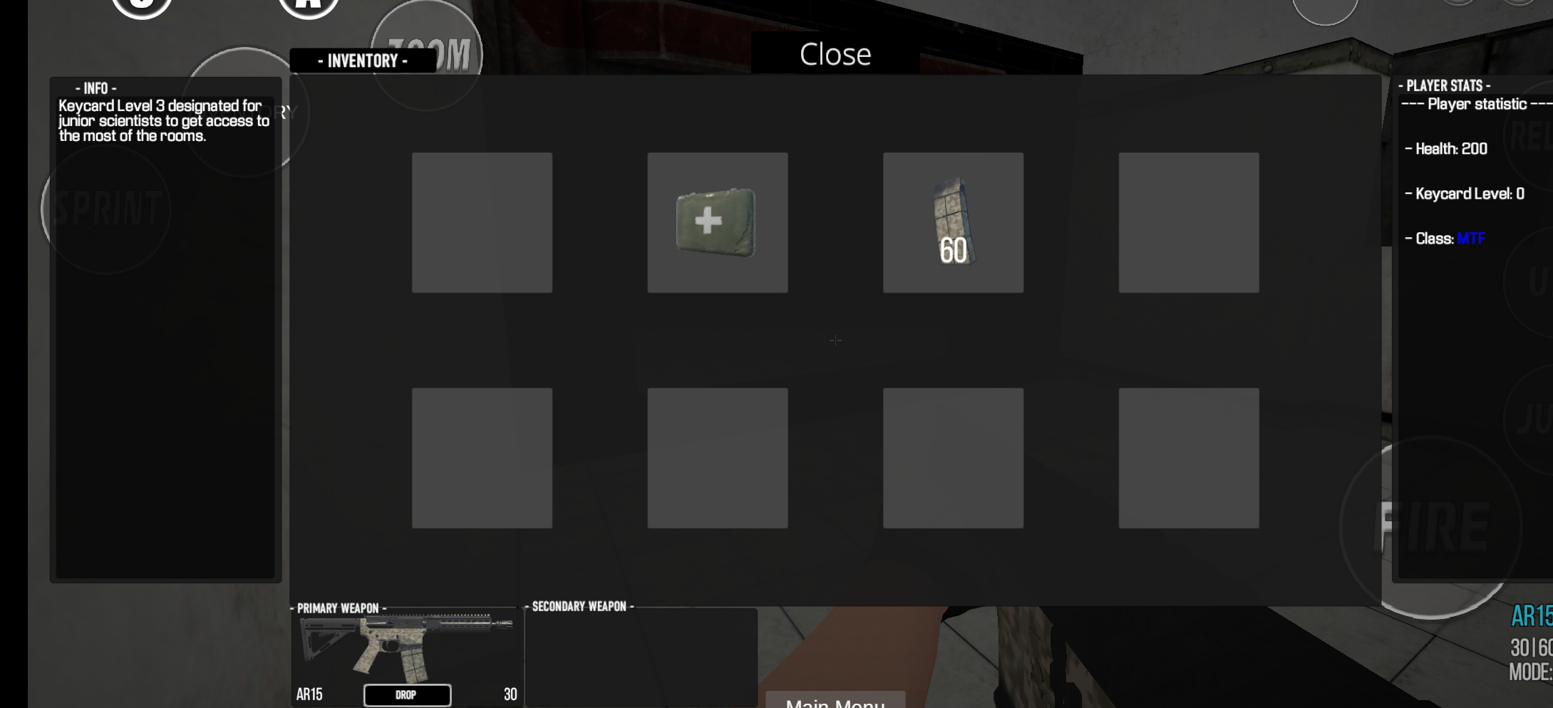 背包有药品子弹与门卡(小万的门卡在琢磨的时候不知道丢哪了)别的不多说,大家都懂。但是门卡很重要,丢了就不能开门了,而且一些门有门卡也开不了,在门口站一会开不了就是开不了了。