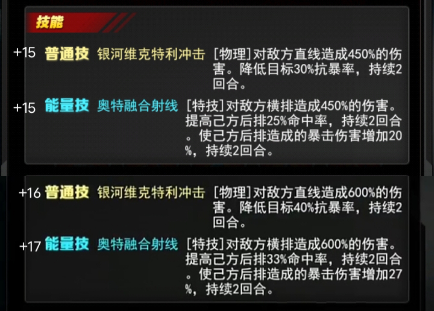 +15 能量技 奥特融合射线[特技]对敌方横排造成450%的伤害。提高己方后排25%命中率,持续2回合。使己方后排造成的暴击伤害增加20