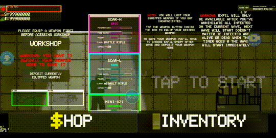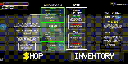 首先,是游戏体验👍,当然对于主界面的各种英语我是一窍不通🙃,但是摸索了一番才发现,想要开始游戏只需要点击右侧那一大串英语就可以了✨,游戏功能只有三个,购买武器,装备武器,和升级防弹衣🤔等,当然这些只是例外,游戏,当然是得好玩有趣❤️。
