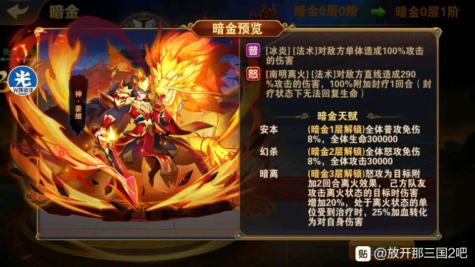暗金姜维这次又出了新的技能,离火效果:诅咒附加增伤,还是两回合。姜维原本只是禁疗而已现在增强到了诅咒,并且升金有增伤,暗金又增伤,直接把姜维的辅助效果发挥到了顶级,姜维本身还有回20怒的效果,加上合击(如果按照满级计算)回怒30,也就是一个怒攻可以回半管怒气,几乎就是永动机了,配合赵云的纯输出,对面的前排怎么玩?不是最强热点是啥?只要姜维足够硬,那就无敌。