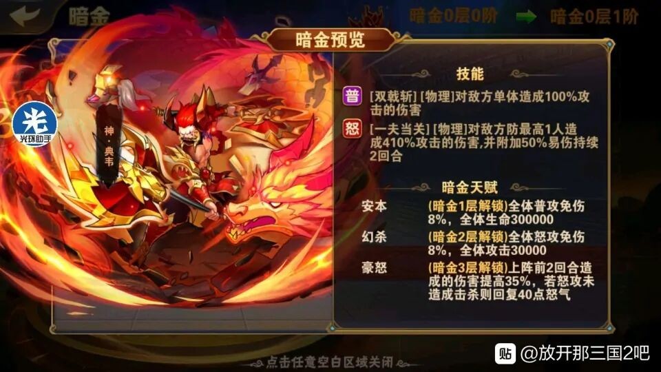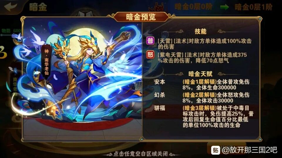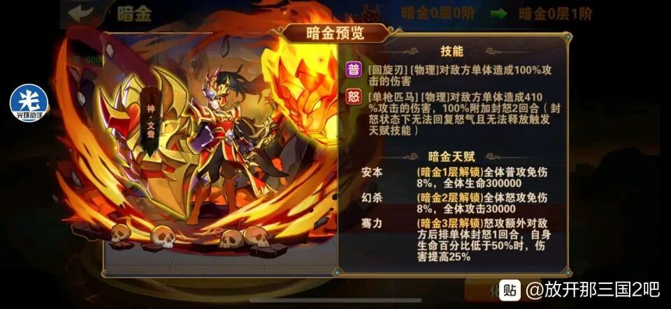 暗金文鸯的技能是怒功附加后排一个封怒一回合,增伤减伤就不看了,作用不大。所以文鸯的暗金就当作怒功后附加一个技能,和姜维的直接增加一个技能差距很大,而且文鸯的附加技能是比较鸡肋的,因为只是给后排加一回合的封怒而已,权当一个小控制吧。暗金南华
