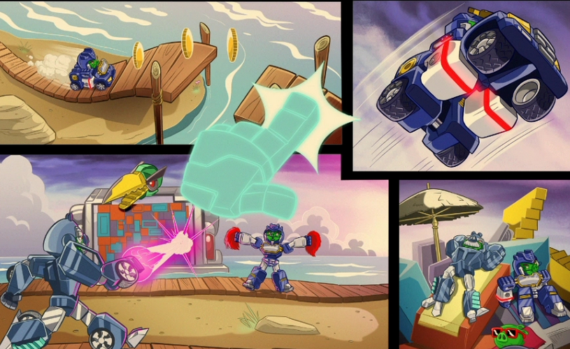 《愤怒的小鸟:变形金刚》虽然依旧沿用了射击闯关类型玩法,但在游戏中也真切的可以将“小鸟擎天柱”给变成汽车人的形状来闯关,那种随意切换形态的帅气变形,就是我们要找的变形金刚!