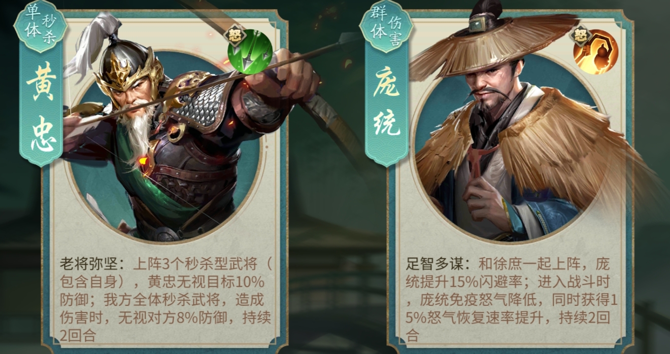 推荐理由:徐庶+庞统。可以提升徐庶的法攻,同时提高徐庶的怒气回复速度。从而前期开荒速度加快,并且也可以提高徐庶的闪避率同时也提高了徐庶的怒气恢复速度。两者都可以免疫怒气降低效果。