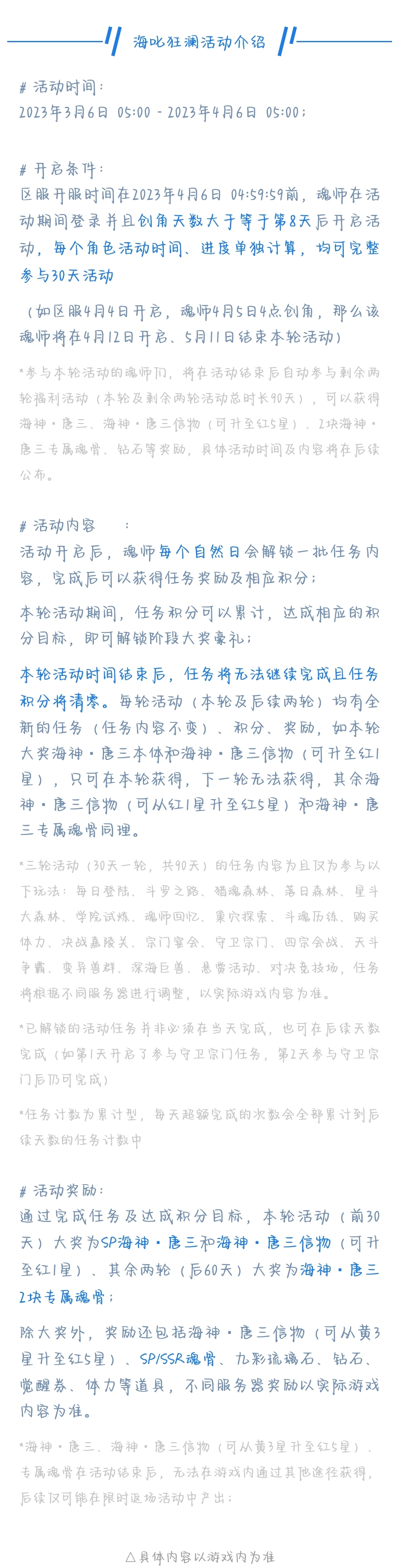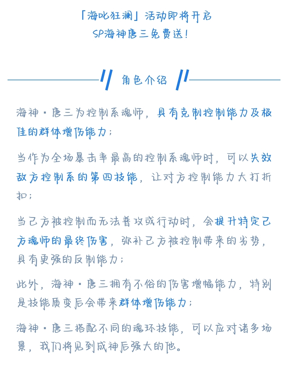 活动预告丨海神之光,开海破浪!SP「海神·唐三」即将上线!参与活动即可免费获取!灼热阳阳发布于 2023-03-05关注海神之光 开海破浪SP海神唐三正式上线!↓↓↓动态展示△具体效果请以游戏内为准活动信息