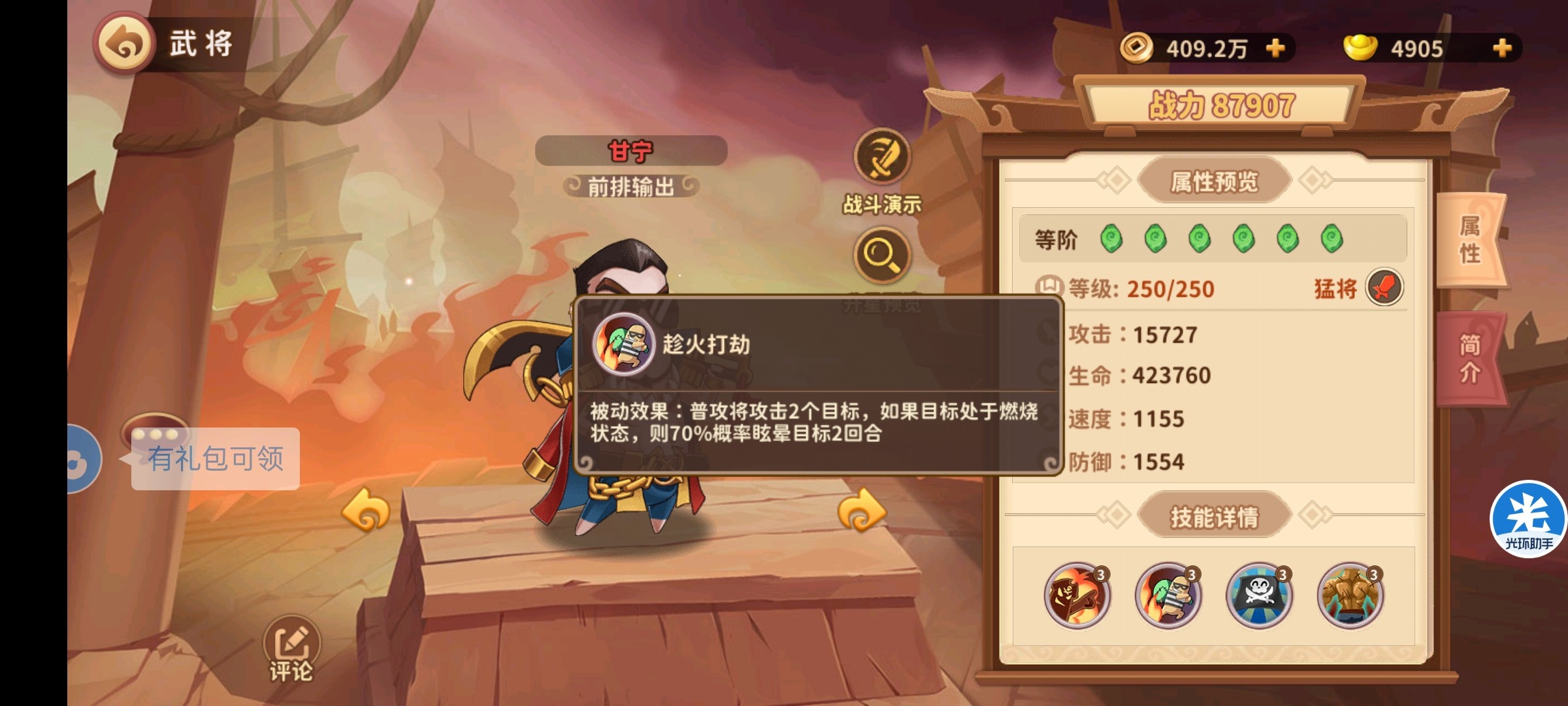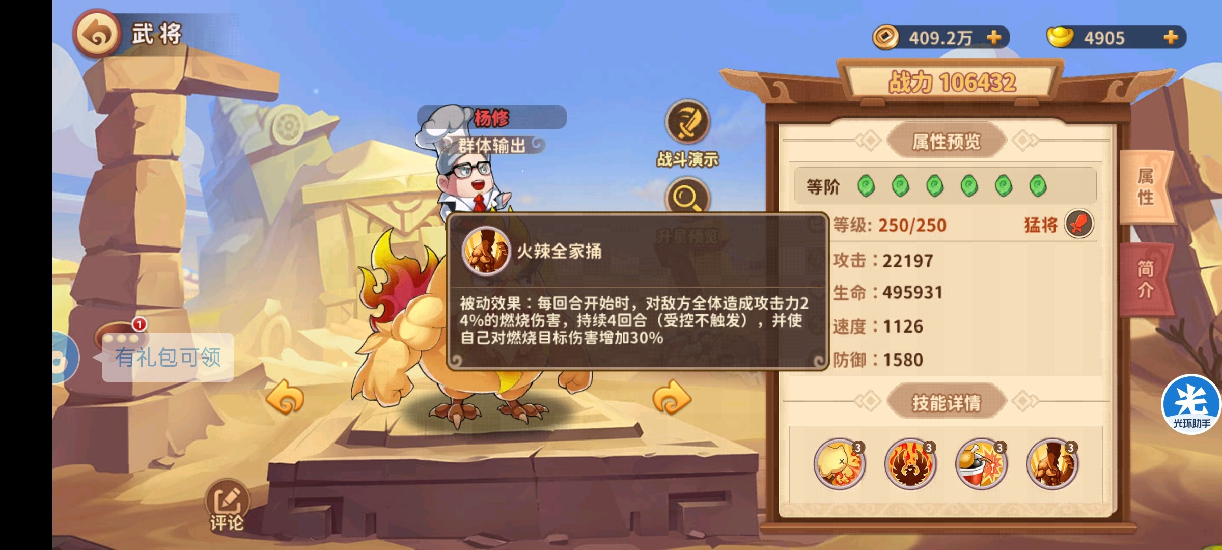 这套阵容的核心思路就是灼烧,通过燃烧buff打伤害,杨修开场对敌方全体施加燃烧伤害,配合甘宁的普攻被动开场就能进行控场。