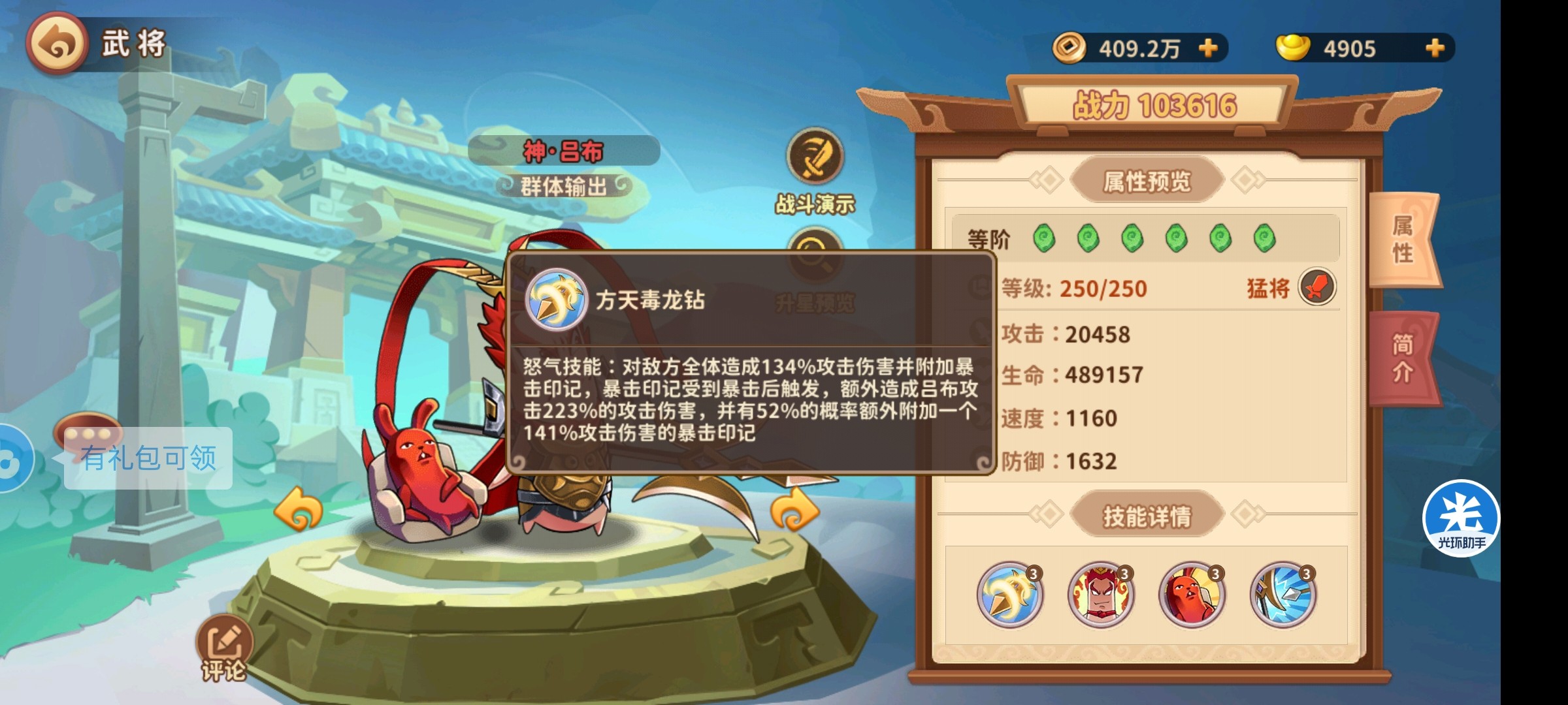 阵容组成:神吕布+甘宁+杨修+黄月英+魔贾诩+魔关羽