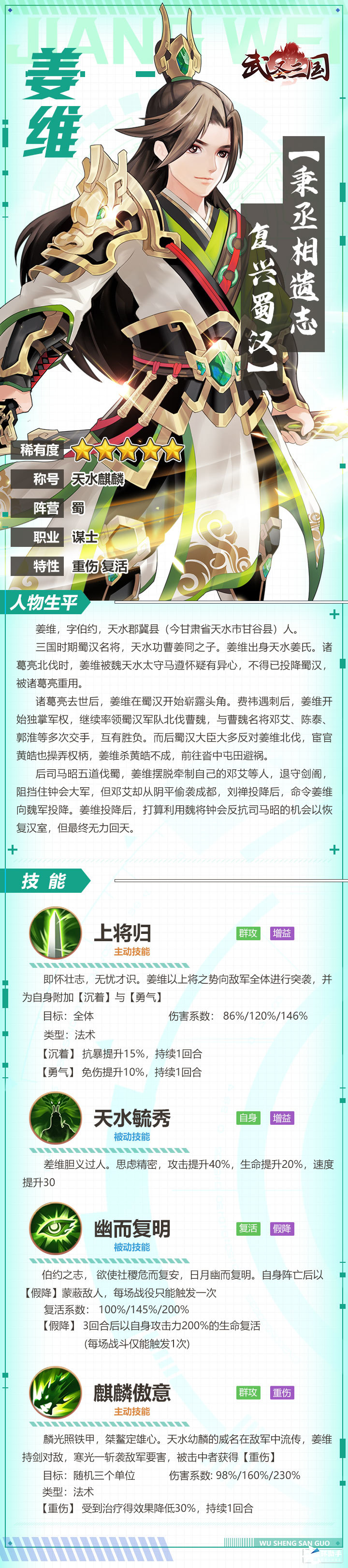 姜维,字伯约,天水郡冀县(今甘肃省天水市甘谷县)人。