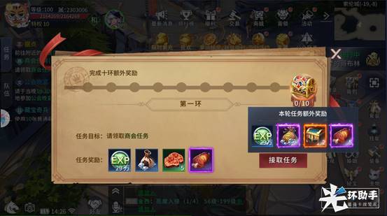 40级开放,单人任务,每天找商会任务使者接取,每10环为一轮,每日可完成两轮。对于前期冲级的玩家来说,这个任务可谓是非ban必选。这是快速升级的好任务之一。有丰富的经验和银币及钻石