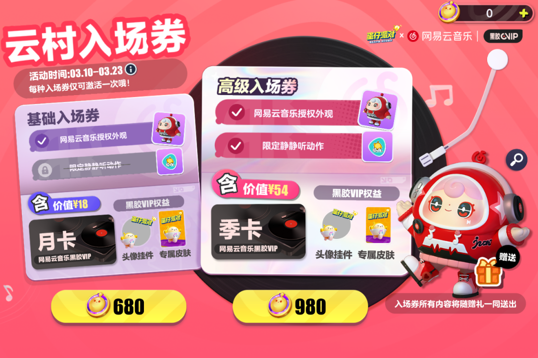 活动期间购买基础云村入场券即可获得网易云音乐授权外观和黑胶会员月卡,更有含静静听动作和黑胶会员季卡的高级入场券可供选择!