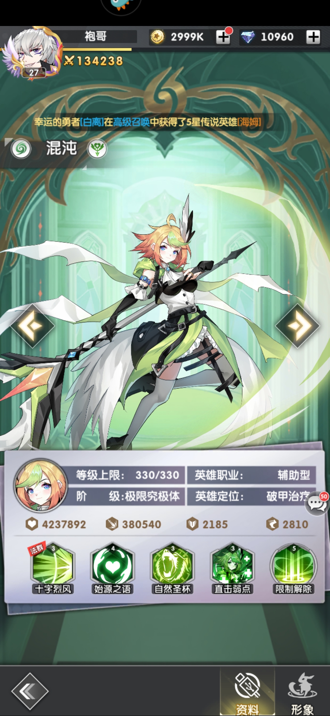 1、混沌 强度T1.5,破甲+闪避治疗,风系不可缺少的奶妈。