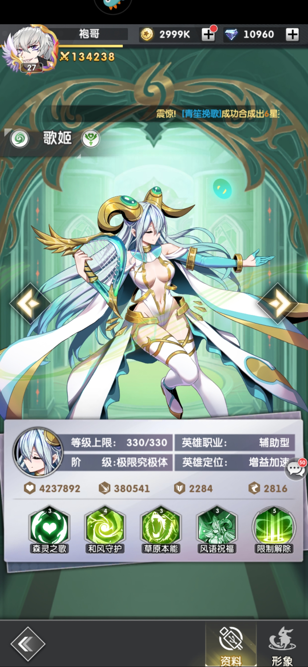 3、歌姬 强度T1,风系增益辅助+治疗,配合胖达好用。