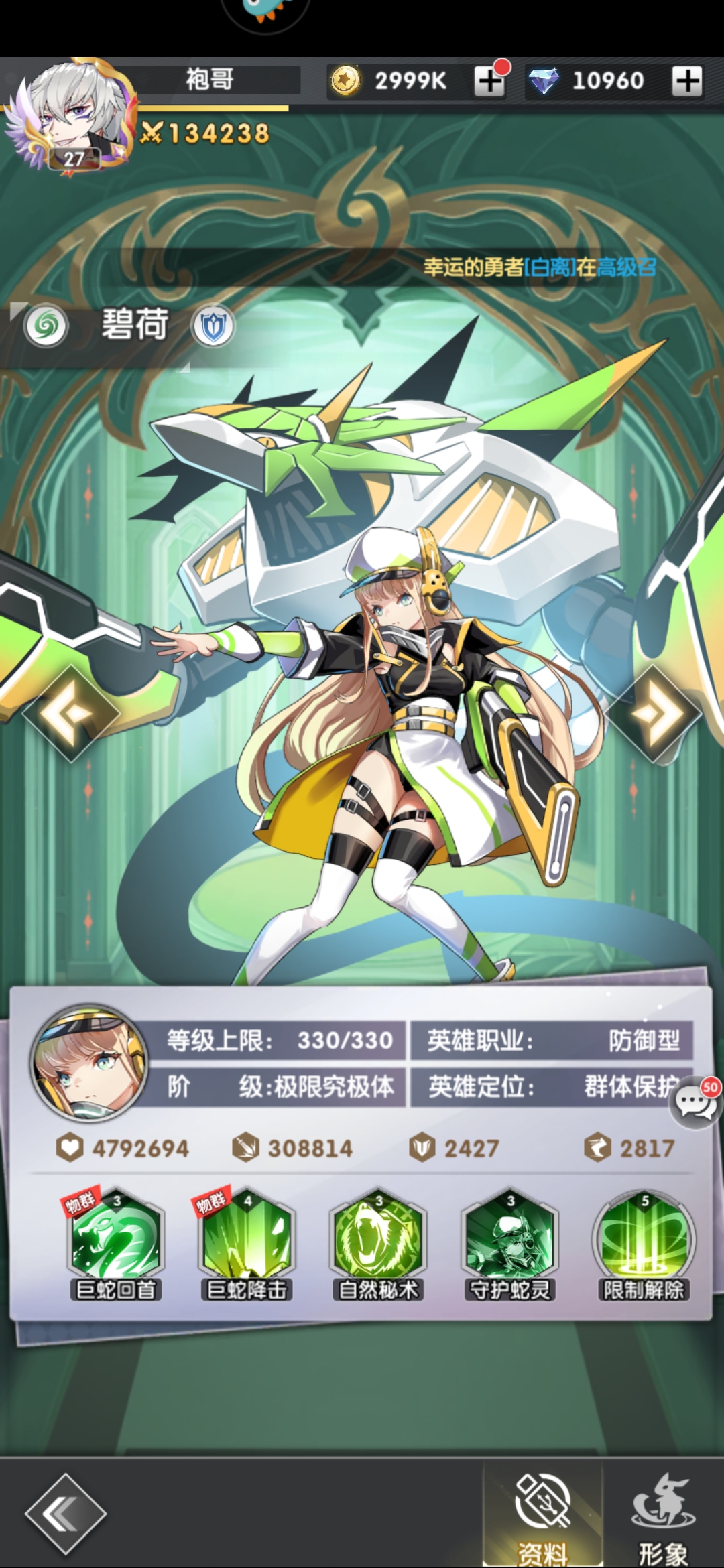 5、碧荷 强度T1,辅助型前排坦克,分担伤害打乱阵型,比较好用。能配合残月打出爆发。
