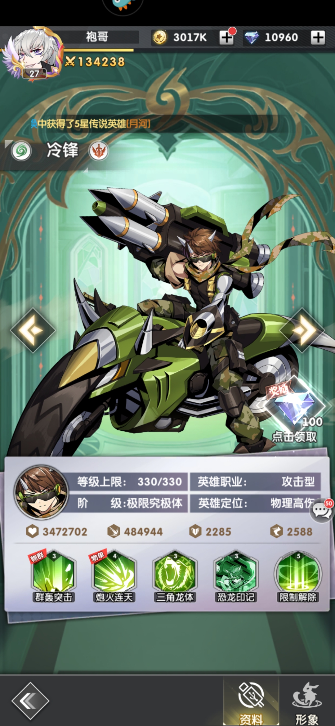 8、冷锋 强度T2,专打前排的英雄,伤害高。前期好用,缺点怕控脆皮。