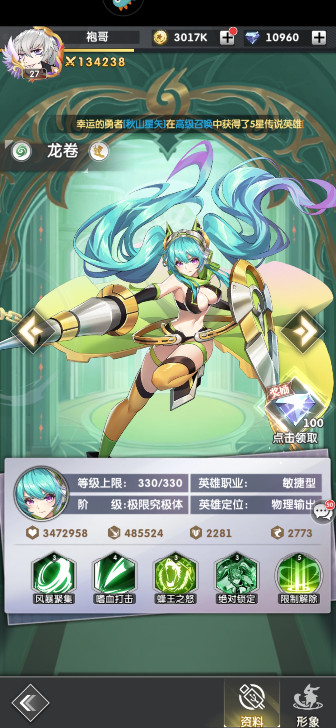 10、龙卷 强度T3,单体后排英雄,前期过度用用。