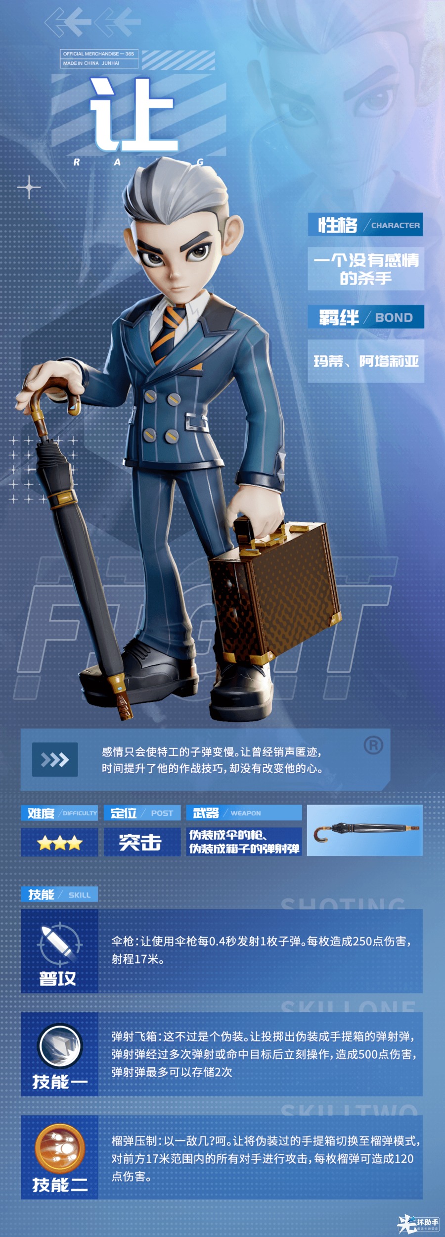 ▷【技能二】榴弹压制:以一敌几?呵。让将伪装过的手提箱切换至榴弹模式,对前方17米范围内的所有对手进行攻击,每枚榴弹可造成120点伤害。