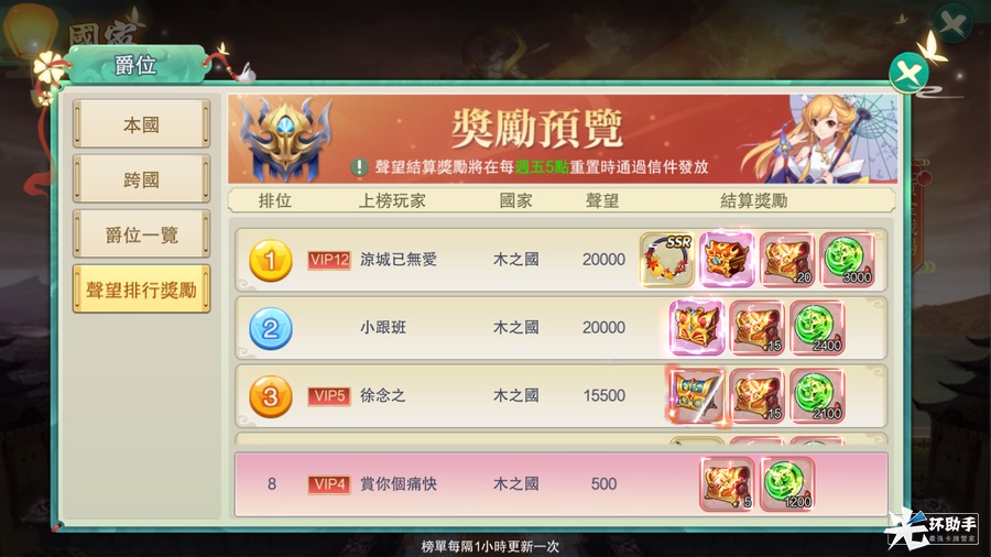 玩家获得爵位头衔之后,每天可以领取对应的俸禄奖励,并在国家分组重置时,根据自己所获得的声望的排名,获得丰厚的结算奖励。