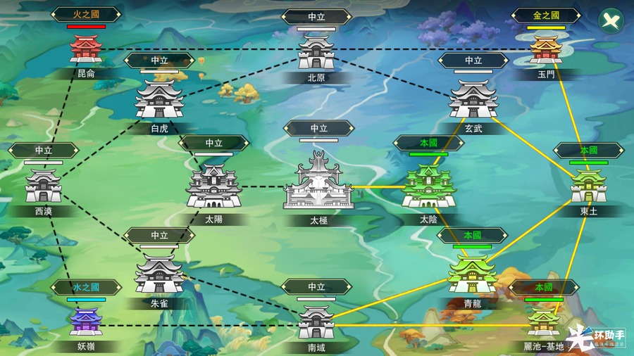 版图玩法是国家中核心的PVE玩法,各服务器从基地出发,挑战相邻的区域副本以获取积分,并通过阵营积分争夺该区域的所属权;或者挑战其他国家已占领的区域副本,来抢夺地盘;