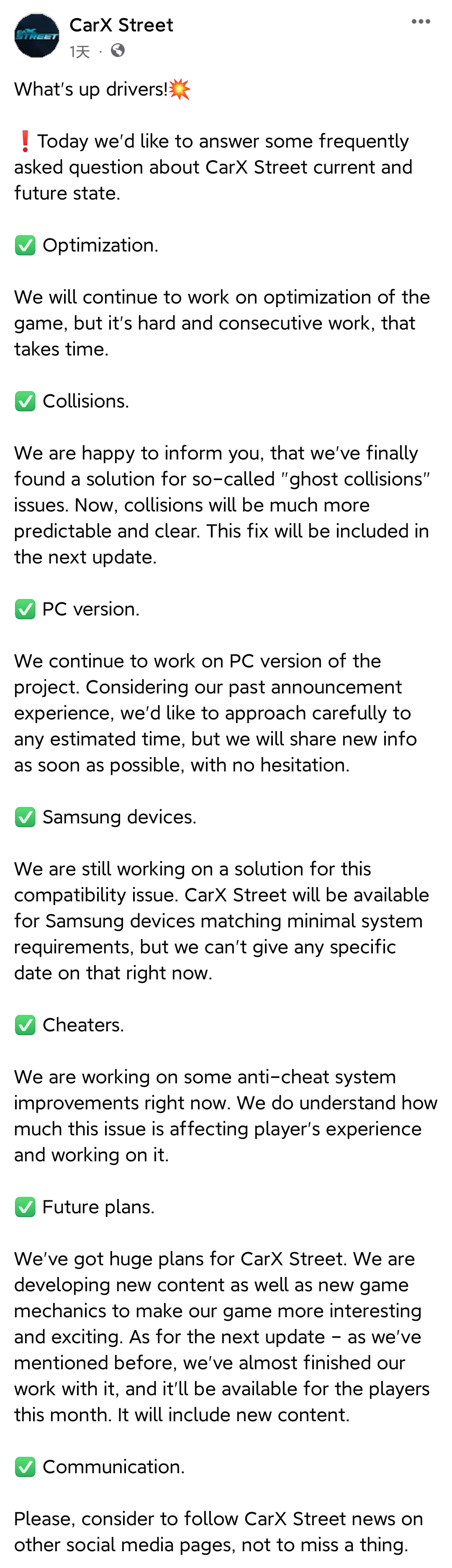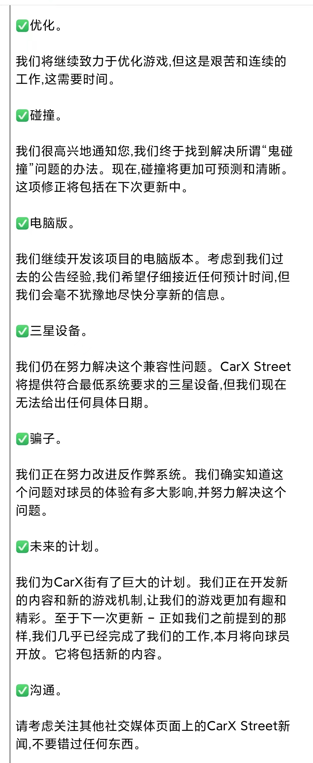 新内容、新机制,carx street官方承诺本月将会有一次重大更新!光环摆渡人发布于 2023-03-12关注官方消息最新爆料,carx street将在本月进行一次重大更新,本次更新内容将会优化在比赛中的幽灵碰撞,以及加强反作弊系统,此外还会有新的内容和机制,敬请期待吧~官方预告 原文翻译: