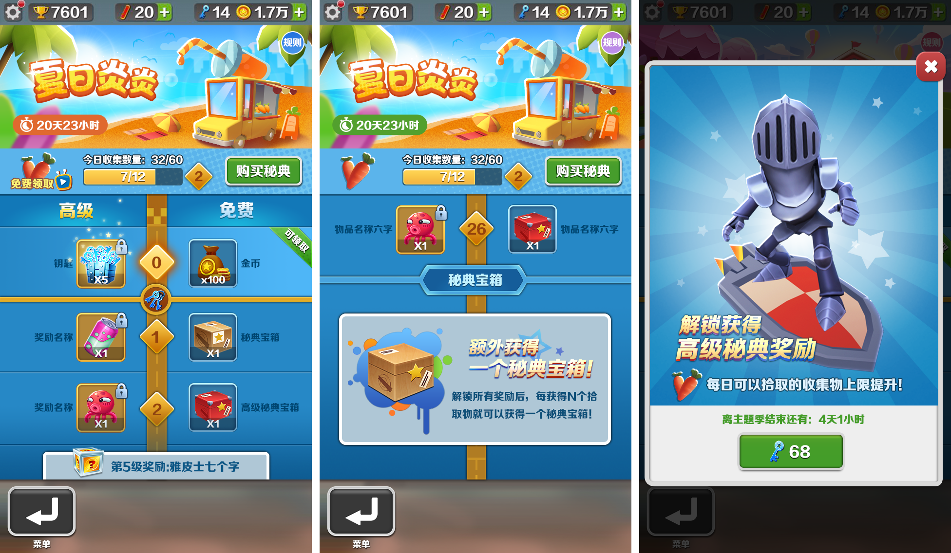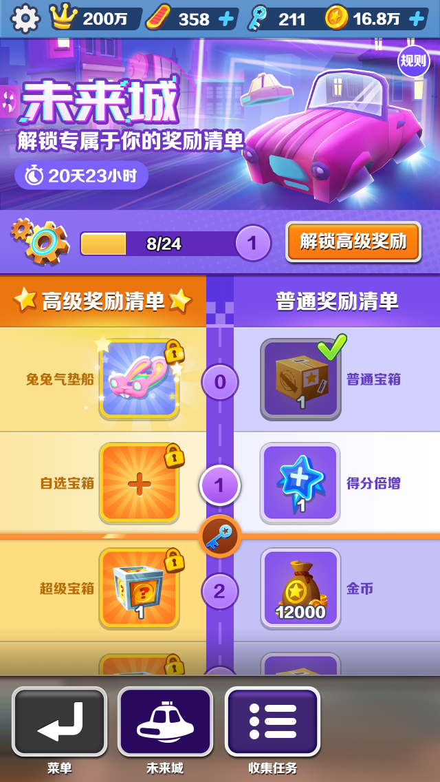 玩家通过参与无尽模式收集掉落在赛道上的胡萝卜,用收集到的收集物解锁专属的清单奖励,消耗一定数量钥匙可以解锁高级奖励清单。