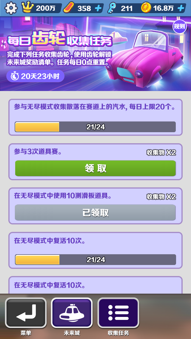 玩家通过参与无尽模式收集掉落在赛道上的收集物齿轮,或在任务界面完成指定的任务收集道具。用收集到的收集物解锁专属的清单奖励,消耗一定数量金币可以解锁高级奖励清单。