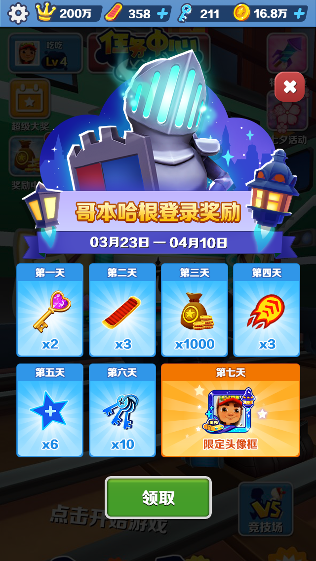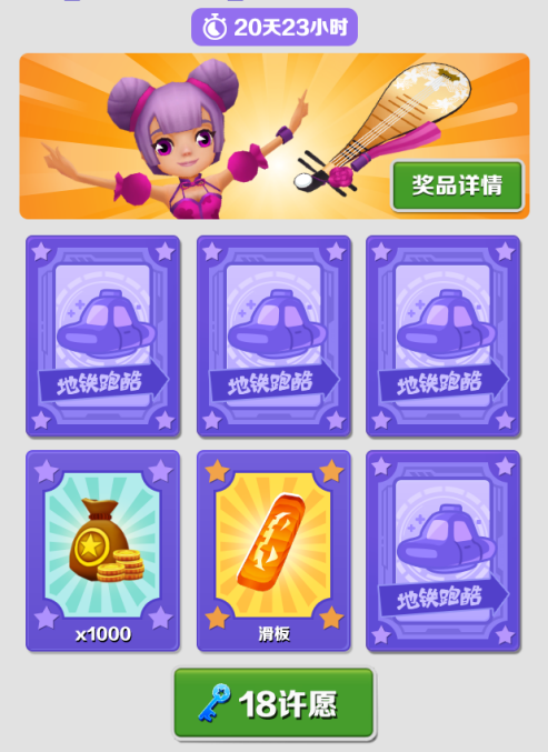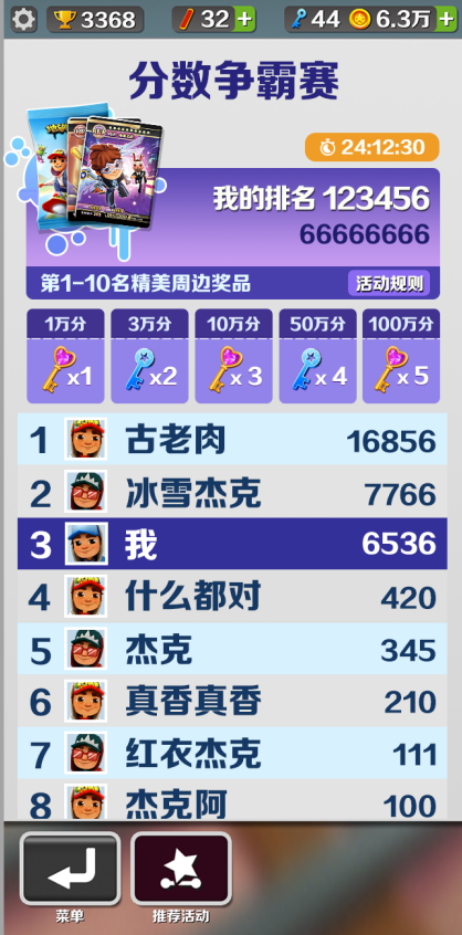 分数争霸赛:在无尽模式达到指定分数时可获得道具福利,排名前十的玩家可获得地铁跑酷实物周边——地铁跑酷卡包!