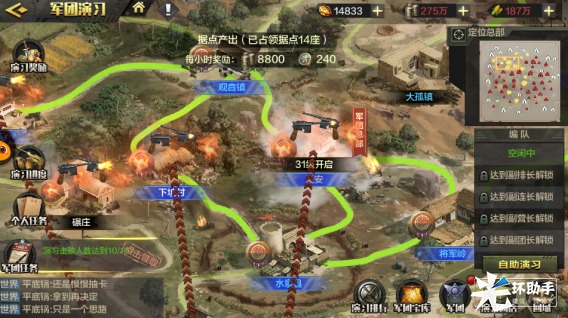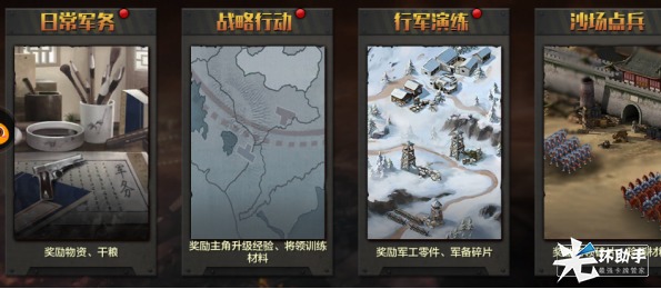 可通过消耗粮食上阵将领自助演习攻城略地,占领据点,持续获得大量的经验与物资,军职越高可挂机的队列越多,可获得的奖励越丰厚,同时在演习期间占领的据点越多军团升级的速度也就越快。