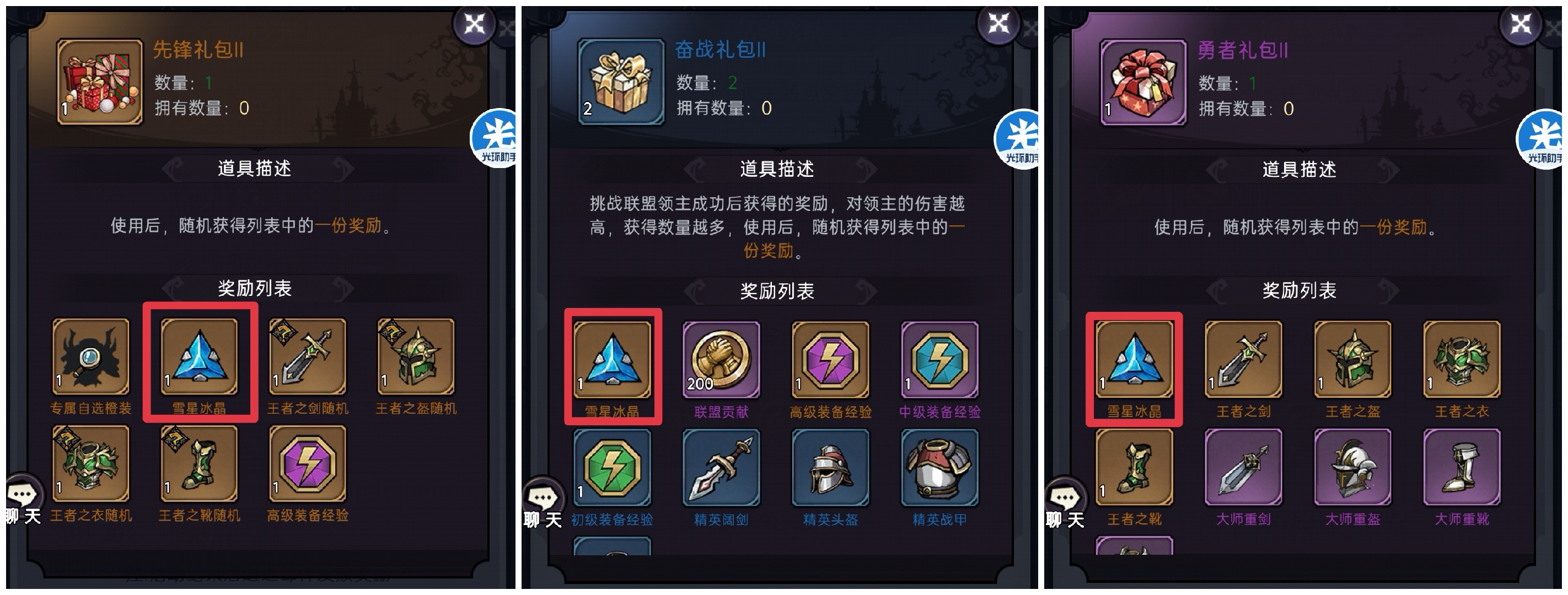 2.奖励特别垃圾,但是你又没法不做。活动产出的三种宝箱里有联盟技能升级必需的“雪星冰晶”,但每个箱子都是随机的,你要撞大运才有可能得到,而且目前只有这一种途径获取。