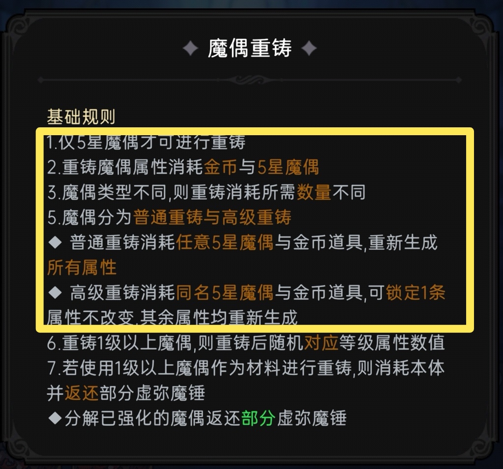 3.魔偶重铸的小技巧:优先用普通重铸,洗到关键属性才用高级重铸。比如洗到马琳,白棋的暴击,爱丽的速度和控制,才用锁定的高级重铸。