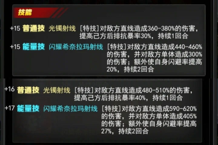 +17 能量技闪耀希奈拉玛射线[特技]对敌方直线造成590-620%的伤害,并对敌方单体造成405%