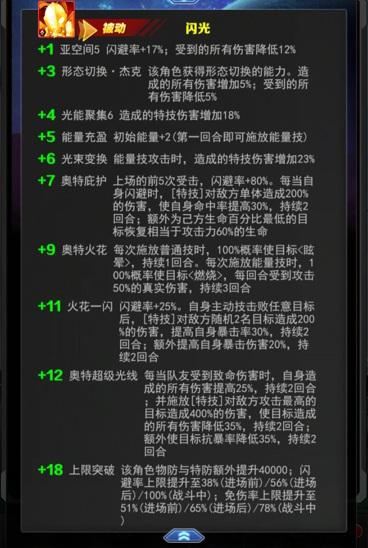 +7 奥特庇护 上场的前5次受击,闪避率+80%。每当自身闪避时,[特技]对敌方单体造成200%
