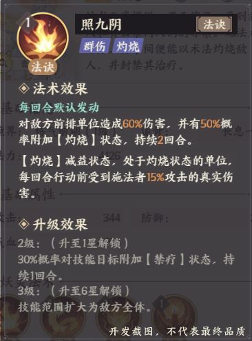 升星后技能攻击敌方全体,概率禁疗打伤害+覆盖灼烧禁疗,增强输出