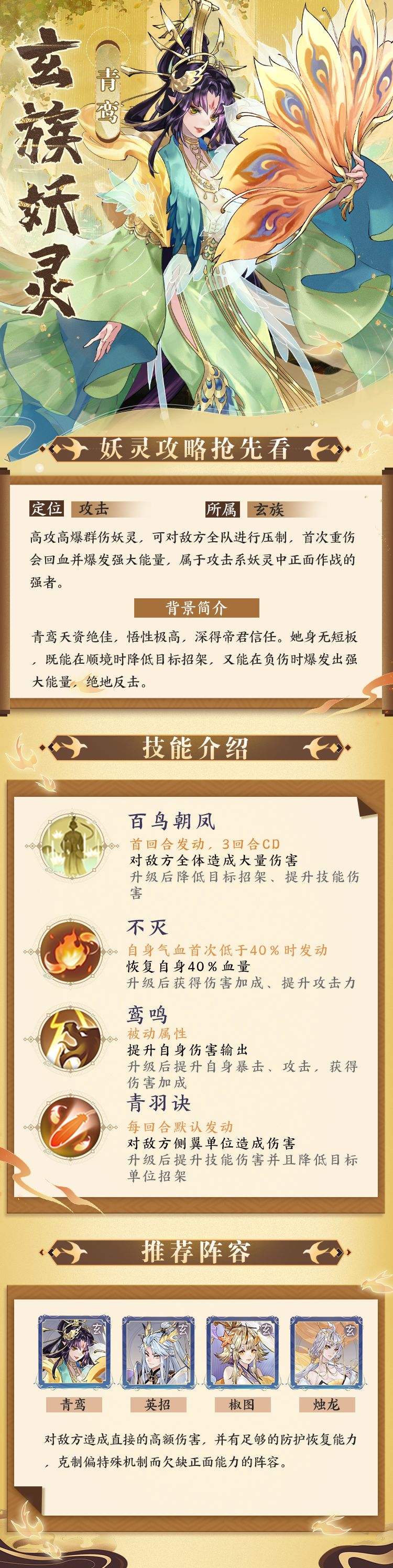 青鸾作为一名暴力群攻妖灵,实战中能对敌方持续进行AOE伤害。与其他群攻妖灵不同的是,青鸾凭借血脉的力量在战斗可以二次爆发。当她重伤时会爆发出青鸾一族的血脉力量,回血的同时大幅加攻增伤,在战斗中经常可以打出绝地反击。