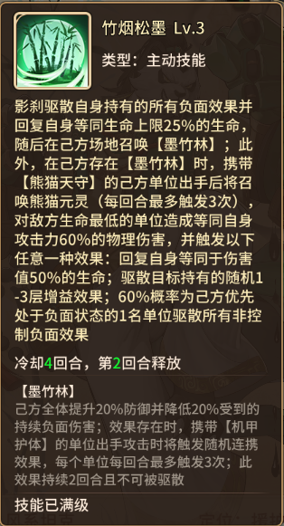魂器35级:【竹烟松墨】Lv3可以在被控制状态下使用,且【墨竹林】持续回合数+1(至3回合);额外提升自身生命上限10%